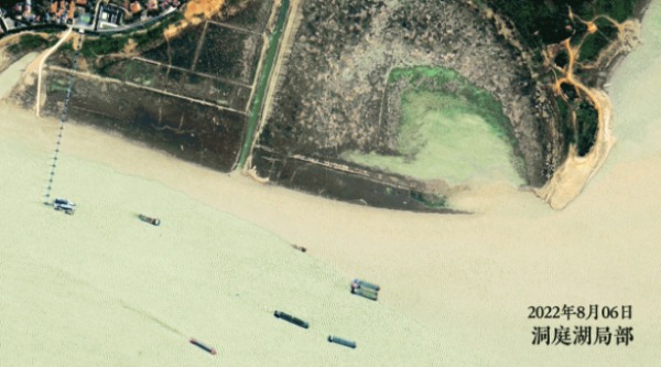 2021年8月31日与2022年8月6日拍摄的湖南岳阳扁山附近的洞庭湖局部卫星影像。
