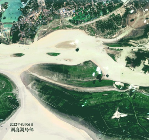 对比吉林一号卫星分别于2021年8月和2022年8月拍摄的洞庭湖,可以明显发现今年8月的洞庭湖水位较去年同期明显偏低,露出更大面积的湖底。