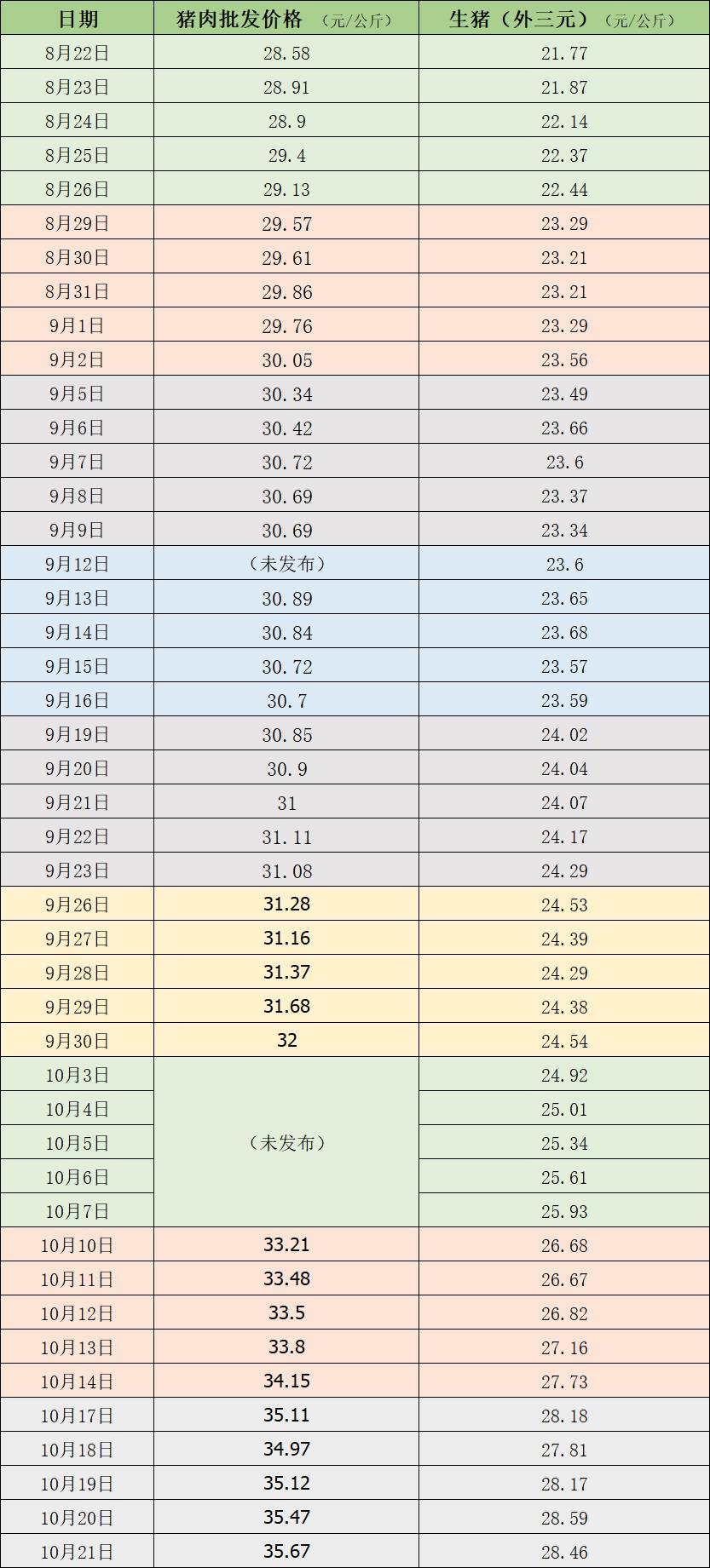 据农业农村部监测,10月21日,全国农产品批发市场猪肉平均价格为35.67元/公斤,比前一天上升0.6%;与上周五(10月14日)的34.15元/公斤相比,上升4.5%;本周的平均价格为35.3元/公斤,与上周33.6元/公斤的平均价格相比,上涨5.1%。