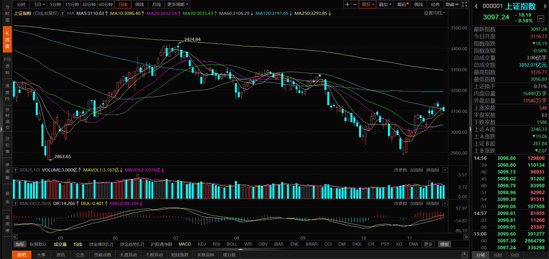 指数方面,集合竞价均小幅高开,早盘基本处于窄幅震荡状态,午后震荡走低。沪指收跌0.58%,创业板指收涨0.16%。两市成交额合计9787亿,较昨日增加近700亿。