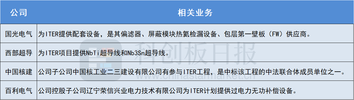 更值得一提的是,我国承担了ITER装置近10%的采购包任务,目前大部分ITER装置采购包部件已实现全国产化。除了中科院等离子体所和核工业西南物理研究院这些研究单位之外,中国的企业也逐渐参与到ITER的工程建设中来。《科创板日报》不完全梳理,这些公司均有参与: