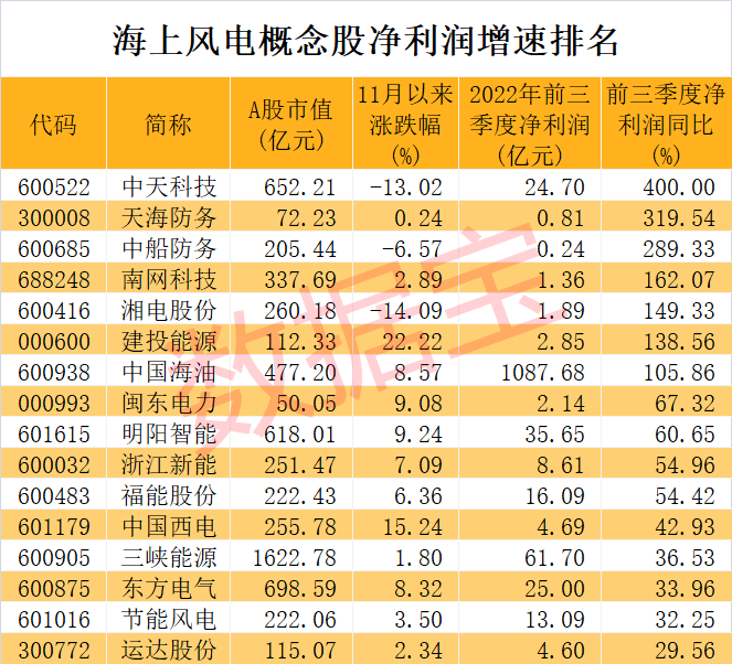证券时报·数据宝统计,A股市场布局海上风电业务的公司有54家。今年前三季度,中天科技、天海防务、中船防务、南网科技、湘电股份、建投能源、中国海油7家公司净利润翻倍增长。净利润增幅最高的是中天科技,公司前三季度实现盈利24.7亿元,同比增长4倍。