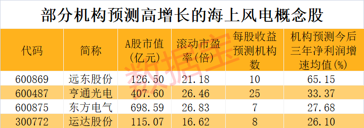 从估值角度来看,截至11月24日收盘,26股滚动市盈率低于30倍。这些市盈率较低的海上风电概念股中,根据5家以上机构一致预测,今后三年净利润增速均有望超20%的股票有4只,分别是远东股份、亨通光电、运达股份、东方电气。
