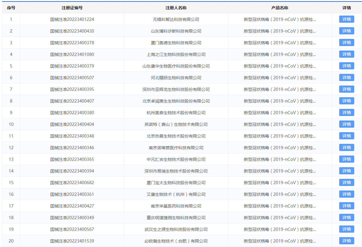 新京报贝壳财经在国家药品监督管理局官网检索发现,目前拥有“新冠抗原检测试剂盒”医疗器械注册证的产品有32种,包含胶体金、乳胶及免疫层析三种方法,据不完全统计,其中涉及之江生物、亚辉龙、热景生物、诺唯赞、丽珠集团等14家上市公司。