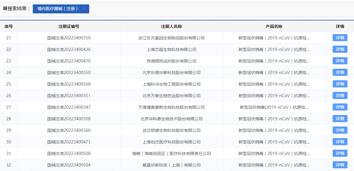 国家药品监督管理局官网显示,目前国内有32款新冠抗原检测试剂盒产品获批。