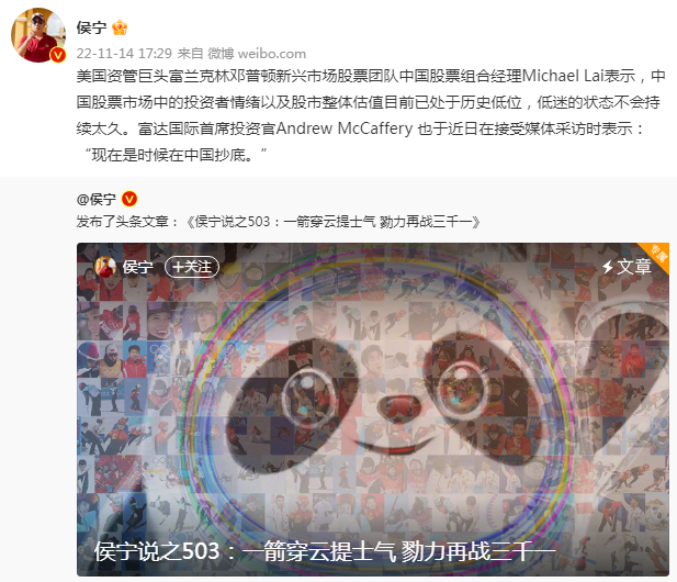 11月13日,侯宁在微博发布了最后一篇股评,标题是《一箭穿云提士气勠力再战三千一》。次日,他转发了这篇文章,并配上了外资投行看多A股的消息。
