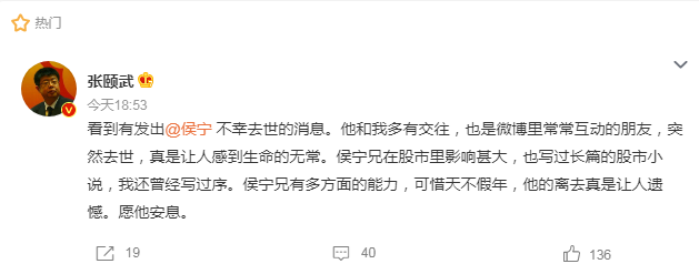 北京大学中文系教授、博士生导师张颐武发微博称:“看到有发出@侯宁不幸去世的消息。他和我多有交往,也是微博里常常互动的朋友,突然去世,真是让人感到生命的无常。侯宁兄在股市里影响甚大,也写过长篇的股市小说,我还曾经写过序。侯宁兄有多方面的能力,可惜天不假年,他的离去真是让人遗憾。愿他安息。”