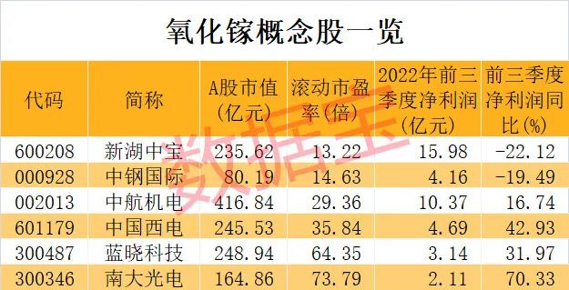 证券时报·数据宝统计,当前A股公司中涉及氧化镓业务的不到10家。今年前三季度,南大光电中国西电蓝晓科技中航机电净利润实现同比增长。截至12月13日收盘,新湖中宝中钢国际2只概念股滚动市盈率不到20倍。最新收盘价与年内高点相比,中航机电中钢国际南大光电等3股回撤幅度逾20%。