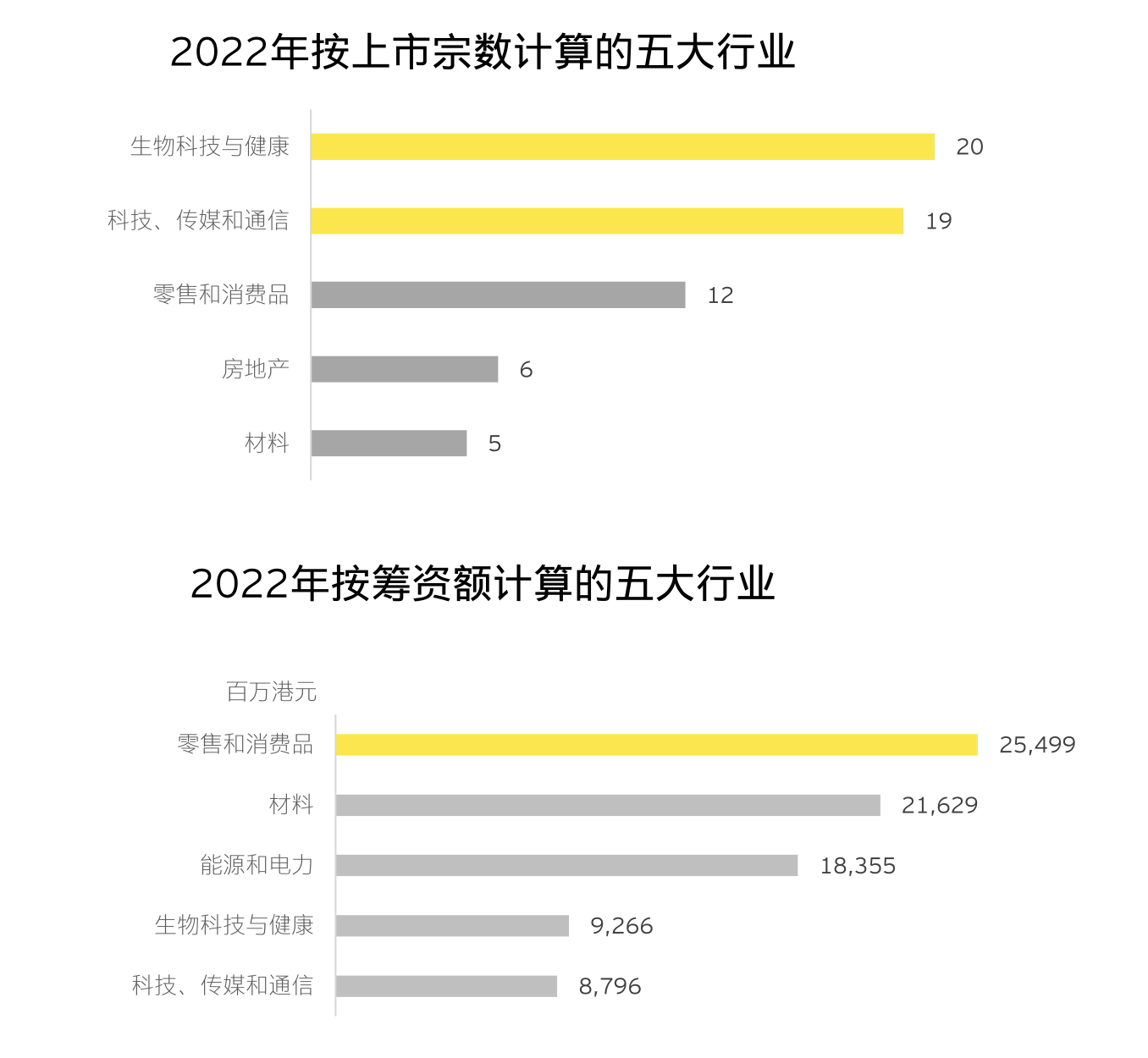 从行业上观察,生物科技与TMT位列IPO数量前两位。但募资额最多的行业是零售与消费品。