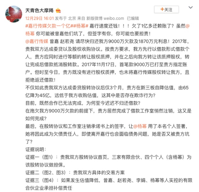 一名网友发布微博称,嘉行传媒欠其1亿多元并公布了股权转让协议等多项证据。