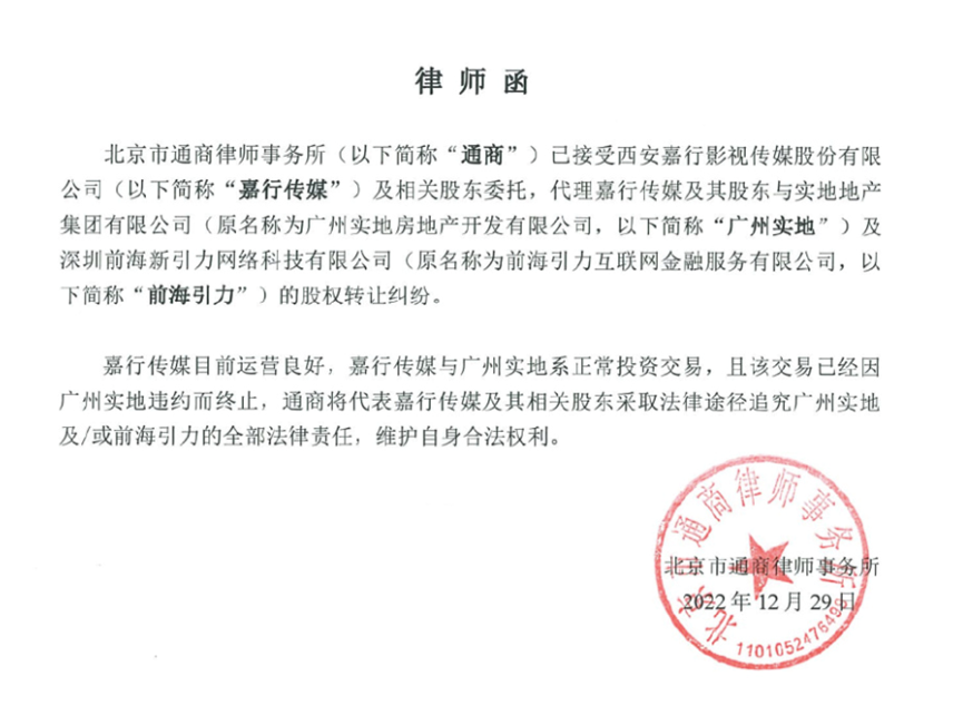 律师函则对事情的来龙去脉进行了简单回应。其表示,该事件系嘉行传媒及其股东,与实地地产集团有限公司及深圳前海新引力网络科技有限公司的股权转让纠纷。