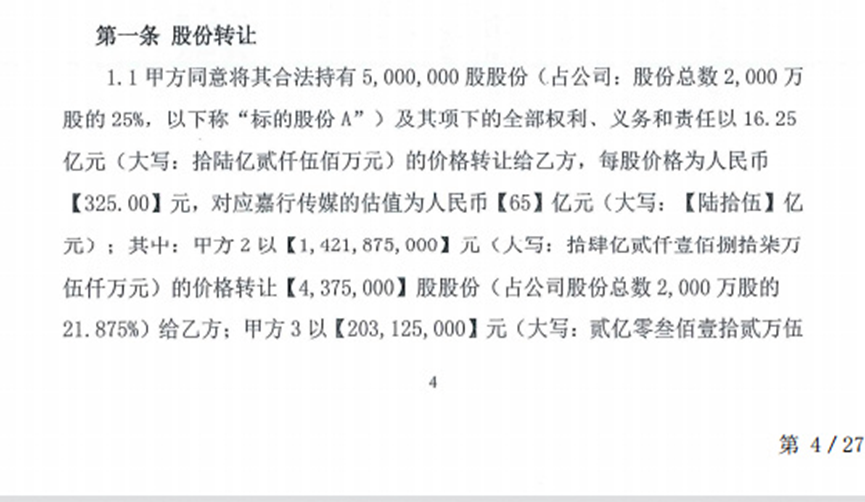 完美世界投资嘉行传媒时,嘉行传媒的估值攀升至50亿元。这也是公开报道中,嘉行传媒的最高估值。而按照上述网友披露的股权转让协议,嘉行传媒在2017年9月的估值曾高达65亿元。