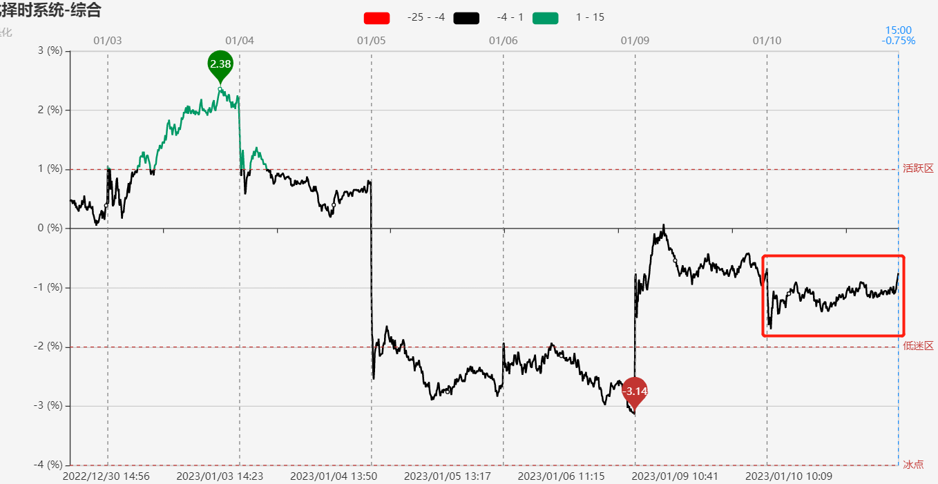 指标显示,市场短线情绪竞价在低迷区上方,盘中主要在0轴和低迷区之间窄幅震荡,全天波动不大。