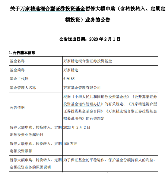 2月1日,万家基金发布公告,旗下万家精选A、C将于2月2日起暂停大额申购、转换转入、定期定额投资业务,两类份额投资限额均定为不超过100万元。随后,招商基金也公告称,旗下招商核心竞争力混合将于2月1日暂停大额申购,A、C两类限购金额均为1万元。