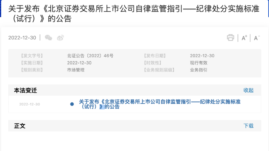 北交所制定了《北京证券交易所上市公司自律监管指引——纪律处分实施标准(试行)》,于2022年12月30日起发布并施行。(下称《实施标准》)