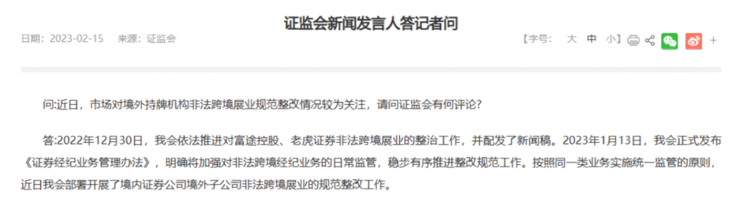 2022年12月30日,证监会依法推进对富途控股、老虎证券非法跨境展业的整治工作,并配发了新闻稿。