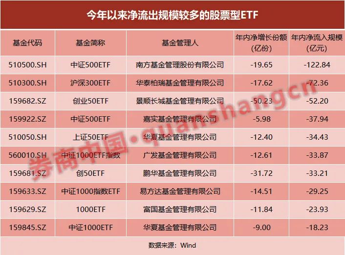 具体来看,南方中证500ETF今年以来份额减少19.69亿份,若以区间成交均价估算,该ETF年内累计资金净流出122.84亿元;华泰柏瑞沪深300ETF今年以来份额减少17.62亿份,年内累计资金净流出72.36亿元;景顺长城创业50ETF今年以来份额减少50.53亿份,期间失血52.2亿元;此外,嘉实中证500ETF、华夏上证50ETF、广发中证1000ETF指数、鹏华创50ETF、易方达中证指数1000ETF、富国1000ETF、华夏中证1000ETF、易方达沪深300ETF等今年以来的资金净流出均在10亿元以上。