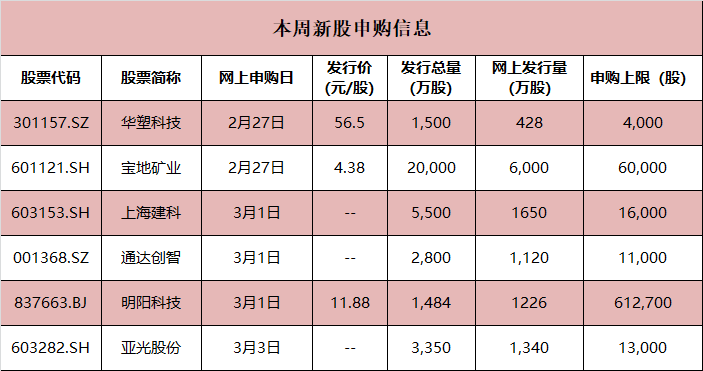 本周(2月27日—3月3日),截至目前,暂有6只新股将进行申购,其中沪市主板3只(宝地矿业、上海建科、亚光股份)、深市主板1只(通达创智)、创业板1只(华塑科技)、北交所1只(明阳科技)。