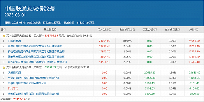 不过,从龙虎榜数据来看,3月1日在方新侠等三大市场知名游资携手北上资金积极做多中国联通的同时,也有部分资金已经在大幅卖出该股,其中沪股通专用席位的卖出金额为2.97亿元,另有一个机构专用席位卖出金额为7108.65万元。