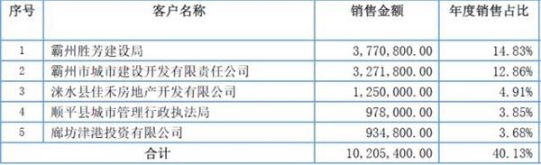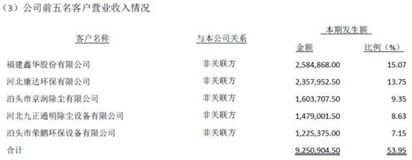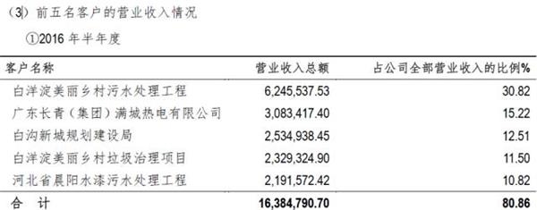 德龙环境主要客户为保定周边环保相关市政机构,2015年前五大客户分别为安新县环境保护局、安新县城市管理行政执法局、白沟新城规划建设局、山东国信环境、雄县污水处理厂,其中对安新县环保局销售收入2898.45万元。