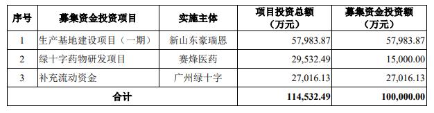 穗绿十字本次拟公开发行股票不超过37996245股,占公司发行后总股本的比例不低于25%,公司本次发行仅限公司公开发行新股,不包括公司股东转让股份。穗绿十字拟募集资金10亿元,用于生产基地建设项目(一期)、绿十字药物研发项目、补充流动资金。