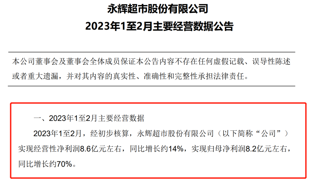 永辉超市(601933)当晚也披露,经初步核算,2023年1至2月该公司实现经营性净利润8.6亿元左右,同比增长约14%,实现归母净利润8.2亿元左右,同比增长约70%。
