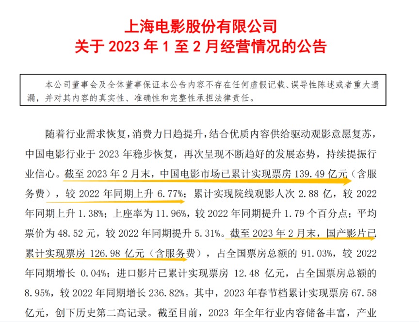 上海电影称,截至目前,2023年全年行业内容储备丰富,产业工业化水平不断提升,伴随居民文娱消费意愿复苏,随着头部影片定档日益常态化,公司对2023年及未来中国电影市场的发展充满信心。