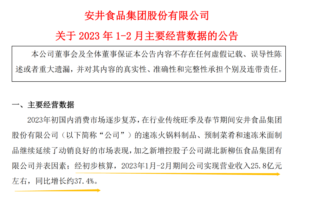 在上游生产端,安井食品(603345)3月12日晚间公告,2023年初国内消费市场逐步复苏,公司在行业传统旺季及春节期间的速冻火锅料制品、预制菜肴和速冻米面制品继续延续了动销良好的市场表现,加之新增控股子公司湖北新柳伍食品集团有限公司并表因素;经初步核算,2023年1月-2月期间公司实现营业收入25.8亿元左右,同比增长约37.4%。
