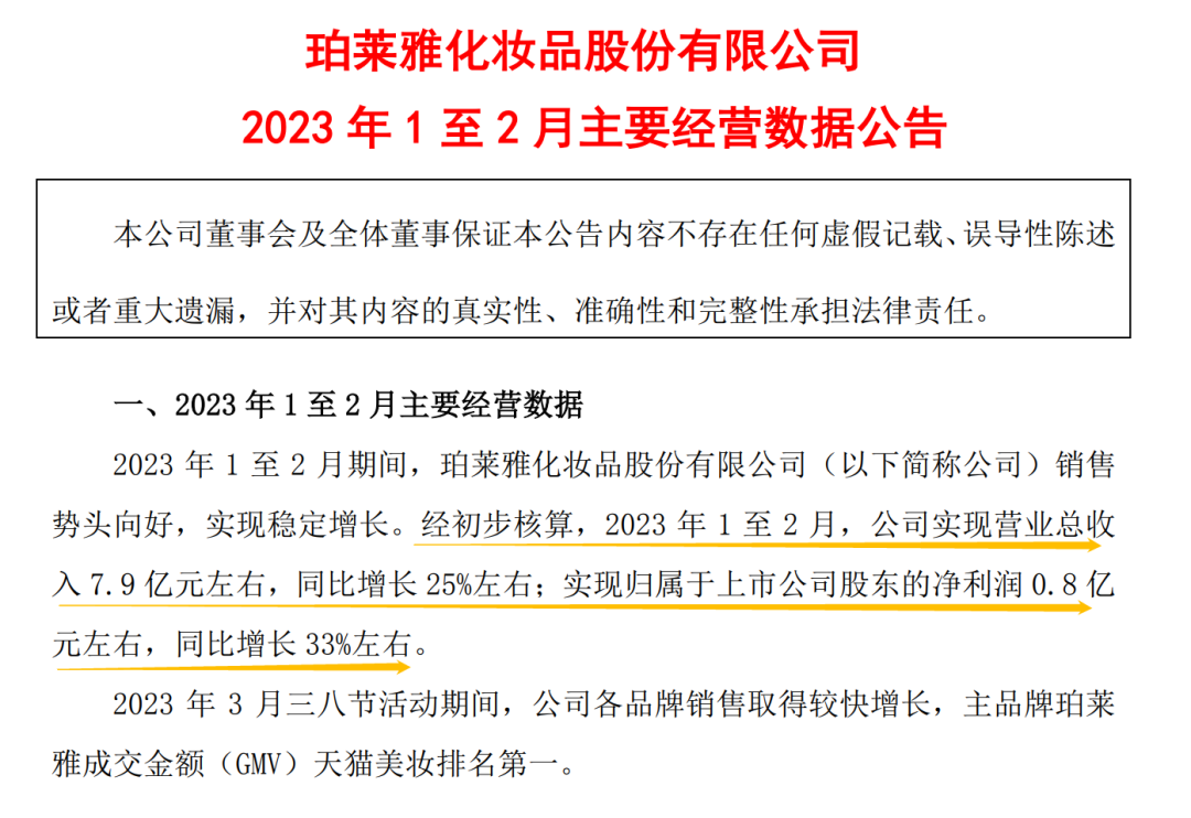 珀莱雅公告还补充,2023年3月三八节活动期间,该公司各品牌销售取得较快增长,主品牌珀莱雅成交金额(GMV)天猫美妆排名第一。