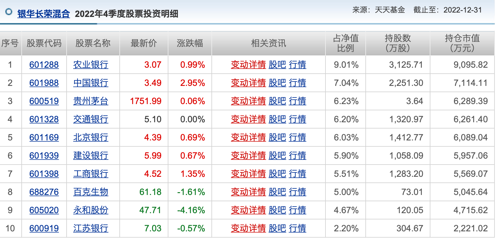 记者找了一下,目前持有银行股最集中的主动型基金有一只,就是胡银玉管理的银华长荣混合。