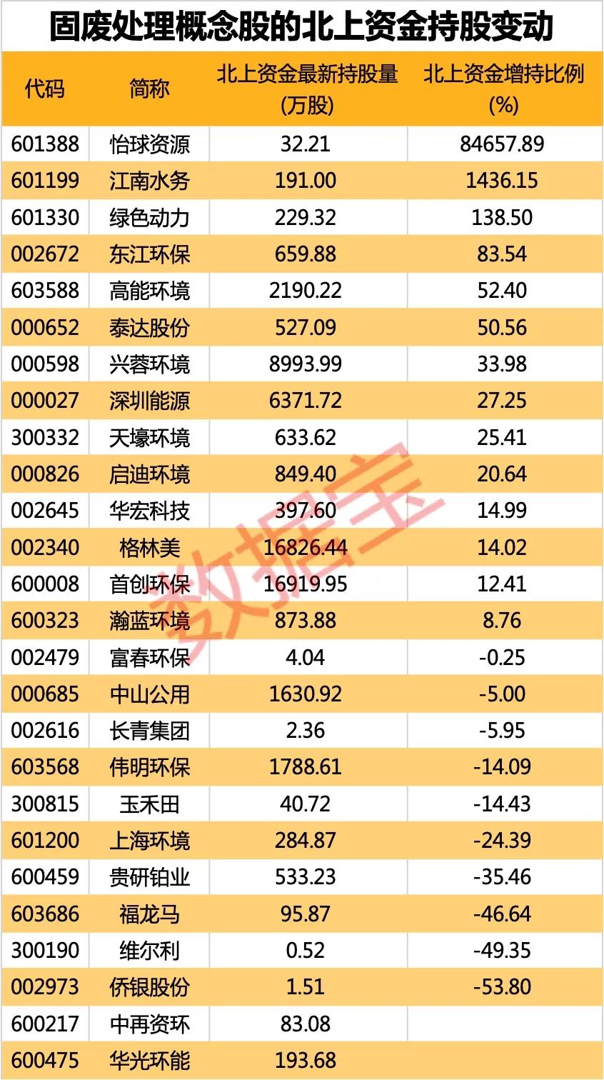 资金方面,不少固废处理概念股获得北上资金青睐。证券时报·数据宝统计,相较于2022年底持仓,怡球资源、江南水务、绿色动力的北上资金持仓股数翻倍,依次为846.58倍、14.36倍、1.39倍。其中,怡球资源与江南水务作为3月13日沪深港通股票范围扩大标的而备受北上资金青睐。