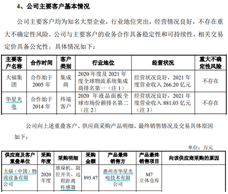 但是根据招股书披露信息显示,鸿安机械是在2014年与华星光电建立的合作关系,前面提到的M7自动化立体仓库项目也是在2020年与华星光电开始合作、在2021年确认的该项目营业收入。可见,鸿安机械总经理盛宏伟在接受采访时表述的与关键客户、关键项目合作时间,均早于公开信息披露,而且在该报道中提到的,对M7自动化立体仓库项目产生重要影响的基恩士并未出现在鸿安机械的公开信息披露中。