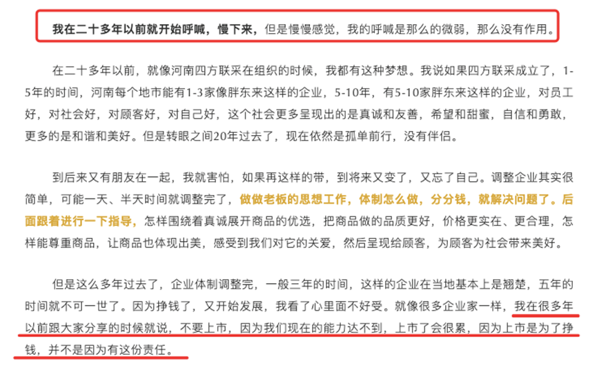 对于上市,于东来表示,自己在很多年以前跟大家分享时候就说,不要上市,因为现在的能力达不到,上市了会很累,“因为上市是为了挣钱,并不是因为有这份责任”。