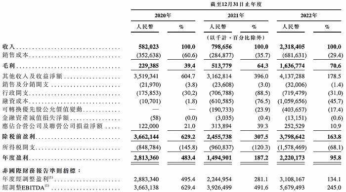 营收方面,京东产发2020年、2021年、2022年收入分别为5.82亿元、7.987亿元、23亿元,2021年及2022年收入同比增长率分别为37.2%、190.3%,营收增长迅速;三年间毛利则分别为2.29亿元、5.13亿元、16.36亿元,毛利率分别为39.4%、64.3%、70.6%。