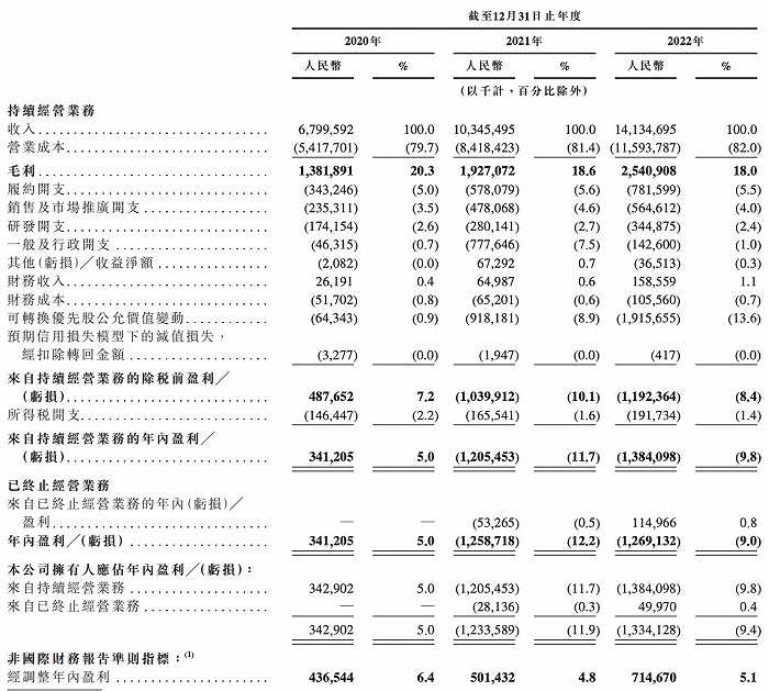 净利润方面,2020年京东工业录得净利润3.41亿元,2021年及2022年则分别录得亏损12.6亿元及12.7亿元。扣除可转换优先股公允价值变动等因素影响,三年间京东工业经调整净利润分别为4.36亿元、5.01亿元、及7.14亿元。