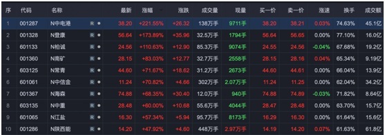 先看炒新行情。记者原本以为,主板注册制下的新股,由于发行价定位较高,市场可能会相对冷静。但这次记者还是看走了眼。10只新股中涨幅最小的陕西能源涨了47%,涨幅最大的中电港涨了221%,而且几乎所有新股盘中都触及临时停牌价,可见参与炒新的资金何等热情。