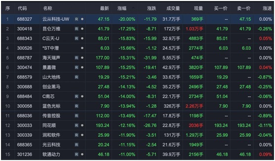 看一下今天的跌幅榜,排名前列的很多都是前期热炒的人工智能板块,比如云从科技、昆仑万维、海天瑞声、景嘉微、金山办公等等,这些个股跌幅均超10%。