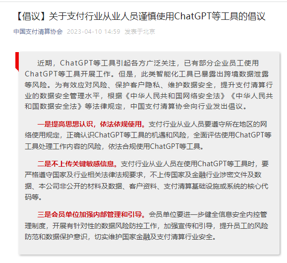 今日收盘之后,也确实有对ChatGPT概念股不利的消息传来。中国支付清算协会10日发布《关于支付行业从业人员谨慎使用ChatGPT等工具的倡议》。其中提出,支付行业从业人员要遵守所在地区的网络使用规定,正确认识ChatGPT等工具的机遇和风险,全面评估使用ChatGPT等工具处理工作内容的风险,依法合规使用ChatGPT等工具。支付行业从业人员在使用ChatGPT等工具时,要严格遵守国家及行业相关法律法规要求,不上传国家及金融行业涉密文件及数据、本公司非公开的材料及数据、客户资料、支付清算基础设施或系统的核心代码等。