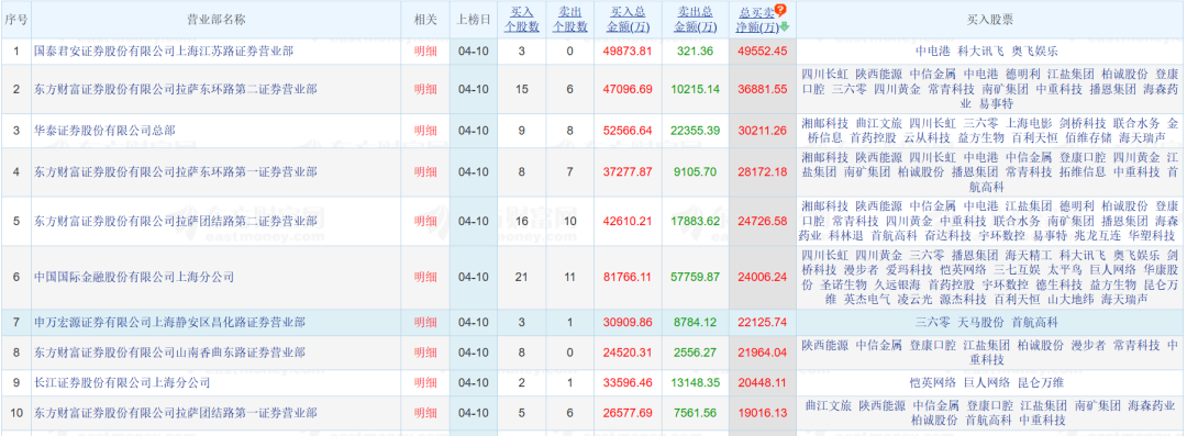 从活跃营业部来看,4月10日当天总买卖净额最大的是国泰君安上海江苏路营业部,总买卖净额达到4.96亿元,主要买入的标的有刚上市的中电港,以及TMT板块的热门股科大讯飞、奥飞娱乐。