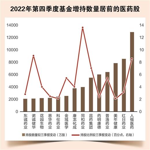 从持仓变动看,去年第四季度,基金对27只医药股增持超千万股,其中人福医药、红日药业、美年健康、普洛药业增持数量居前,均超6000万股。人福医药的增持股数最多,合计增加1.28亿股,基金持股比例从去年三季报的4.49%提升至第四季度的13.11%。普瑞眼科、同和药业、首药控股、泰恩康的持股比例较三季报增长超10个百分点。