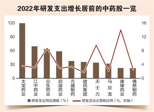 中药不但传承历史,也面向未来,中医药企业不断加大研发投入力度,提高中药的科技含量。数据宝统计,2019年,A股中药板块上市公司研发支出合计为85.12亿元,2021年增长到102.59亿元,增长幅度超过20%。目前已有27家中药上市公司披露2022年研发支出,其中22家均同比呈现增长,太龙药业、江中药业、众生药业、启迪药业的研发支出同比增幅均在50%以上。