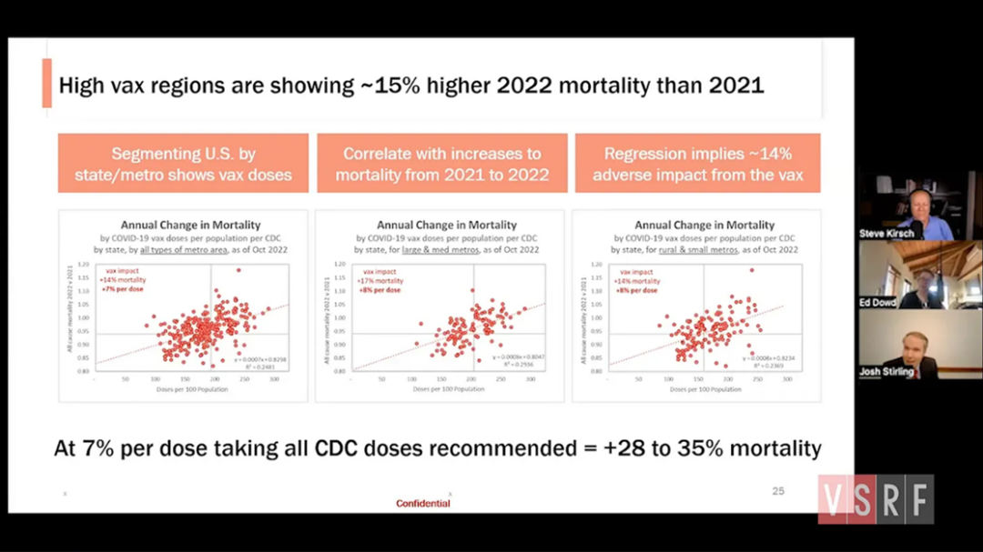进一步检索可以发现,斯特林的这一说法早在2022年12月已经出现,他在参加一场由疫苗安全研究基金会(Vaccine Safety Research Foundation,简称VSRF)组织的直播时,将2021年至2022年的美国各城市地区的死亡率变化与新冠疫苗每一百人接种数量相关联,称发现这两个变量之间存在正相关——那些平均接种疫苗数量较多的地区的全因死亡率的增长更快。斯特林得出结论:人们每多接种1剂疫苗,死亡率就会相比上一年多增加7%。