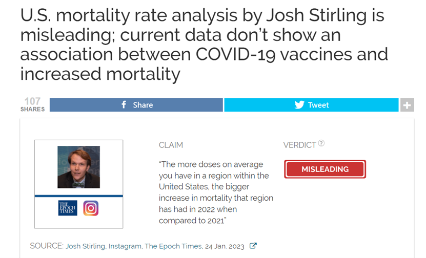 斯特灵的说法基于对美国不同地区的死亡率与疫苗覆盖水平的比较。然而,这种分析并没有囊括死者是否接种疫苗、是否因疫苗接种而死亡的相关信息,且数据的相关性不足以证明因果关系,因此不能提供关于接种疫苗是否会导致死亡率上升的可靠结论。