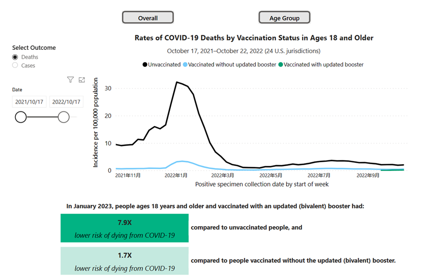 美国CDC发表的美国18岁及以上人群的新冠死亡率图表。