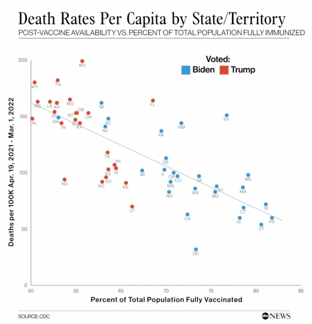 美国广播公司(ABC News)将2021年4月至2022年3月期间每个州的绝对死亡率与疫苗接种覆盖率进行了比较,发现疫苗接种覆盖率较低的州往往死亡率较高,这与斯特林的结论相矛盾。