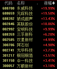 宝明科技两连板,英联股份涨停,骄成超声、元琛科技涨超13%,三孚新科涨超6%,双星新材、阿石创涨近5%。