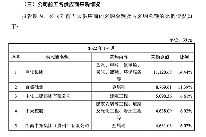 而在中天氟硅招股书中,合盛硅业同东岳硅材、新安股份和兴发集团一起被列为同行业可比公司。也就是说,报告期内,中天氟硅的前几大供应商主要由其大股东及竞争对手构成。