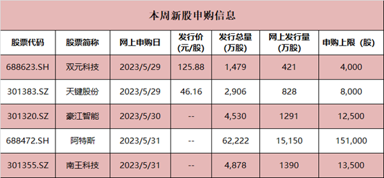 本周(5月29日—6月2日),共有5只新股将进行申购,其中创业板3只(天键股份、豪江智能、南王科技)、科创板2只(双元科技、阿特斯)。
