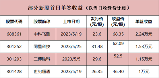 数据显示,截至目前,5月以来的上市的29只新股(含北交所新股),仅有8股首日破发,且整体跌幅较小,如上周上市的朗坤科技环境、英特科、美邦科技首日分别下跌10.65%、7.23%、4.56%。多数仍实现正收益,且有部分个股上市首日单签收益超万元,如以首日收盘价计算,中科飞测单签收益超2万元,同兴科技收益超1.5万元,三博脑科收益超1万元。