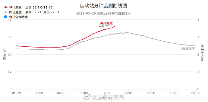 5月29日,澎湃新闻记者从上海市气象台获悉,13时09分,徐家汇站气温36.1℃,打破了百年来的上海五月气温最高纪录,之前最高纪录是35.7℃,分别出现在1876年、1903年、1915年和2018年。